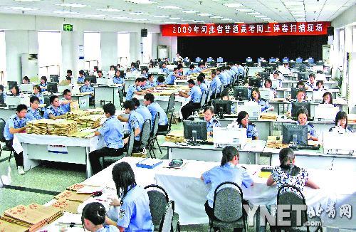經(jīng)過武警和當(dāng)?shù)乜荚嚈C(jī)構(gòu)的嚴(yán)格檢查,記者首入設(shè)置在河北省考試院的答題卡掃描現(xiàn)場。寬敞明亮的大廳內(nèi),100多名河北某司法院校的學(xué)生經(jīng)過培訓(xùn),正在按流水線操作、軍事化管理的方式,在26臺(tái)高速掃描儀上分科目進(jìn)行高考答題卡的掃描。
